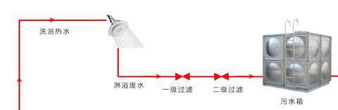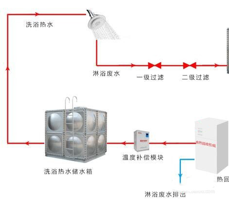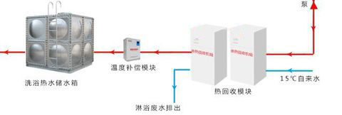 利用管道让洗浴下来的废热水(一般在32℃-40℃)统一流入金宸洗浴热回收系统机组里,同时接入新鲜或者干净冷水(一般为常温),也就是让干净冷水和洗浴废热水同时进入里。