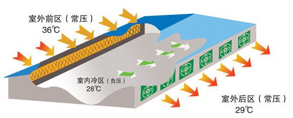 湿帘降温系统的降温过程是其核心-湿帘内完成的。在波纹的纤维纸表机有层薄薄的水膜,当室外干热空气被风机抽吸穿过湿帘时,水膜上的水会吸收空气中的热量进而蒸发成水蒸气,这样经过处理后的凉爽湿润空气就进入室内了。这自然的过程犹如风次过水面一样。
